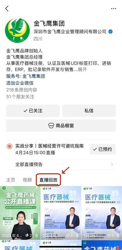 划重点! 往期直播培训课程支持回放,关注“金飞鹰药械咨询服务”视频号并点击视频号主页,即可查看“直播回放”哦~